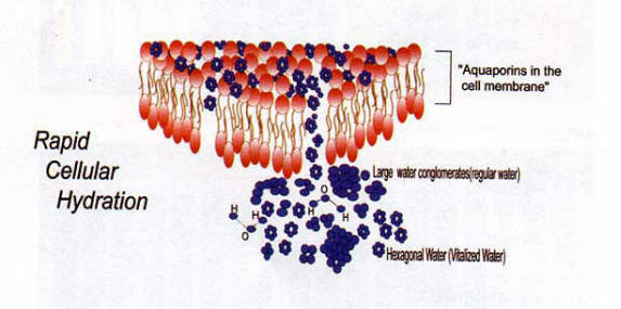Rapid or near-instant absorption is accomplished by the hexagonal clustering process. Larger and unorganized clusters of water molecules have a more difficult time penetrating the cellular membrane; hexagonal, organized water clusters penetrate the membrane far easier, as illustrated in the Bioelectric Impedance Analyzer data immediately below the following figure.