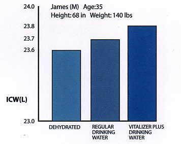 The results of tests conducted on the Vitalizer Plus™ water are illustrated below where a substantial increase in Intra-Cellular water is experienced for an individual with normal body weight, height and age. Results may vary depending on individual water usage, weight, height and age.