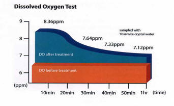 In the Vitalizer Plus™, a powerful vortex increases the oxygen content of the water. A 30% increase in dissolved oxygen over even good quality bottled water can be realized as illustrated below. To experience the greatest benefit of this increased oxygenation level, the Vitalizer Plus™ water should be used within 20 minutes of preparation.